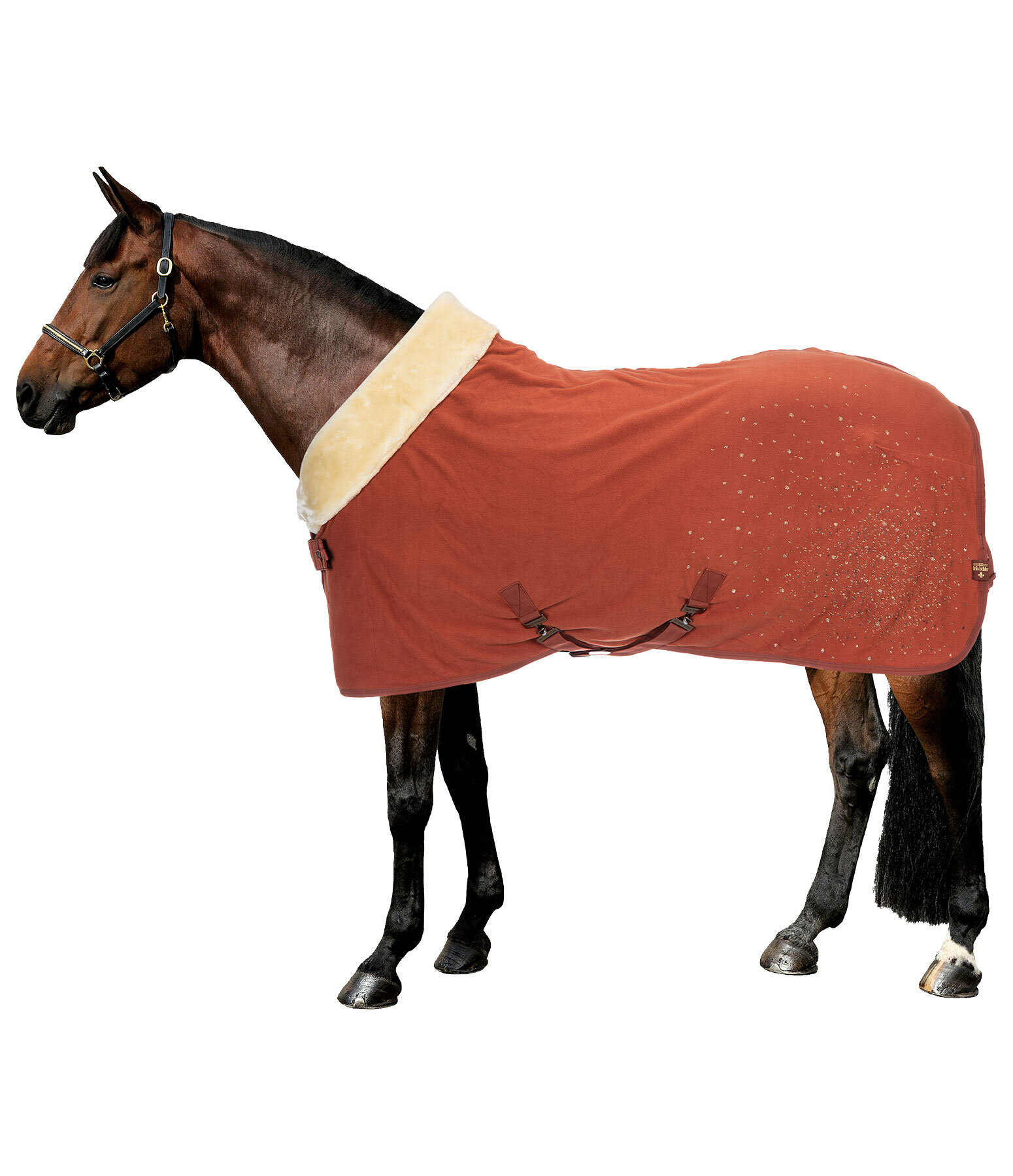 Przytulny, ciepły, a jednocześnie oddychający koc przeciwpotny wykonany z wysokiej jakości polaru antypillingowego z miękkim, grubo wyściełanym kołnierzem typu „teddy”. Na lewym tylnym panelu znajduje się uroczy nadruk z wielobarwnymi drobinkami brokatu. Gładka, przyjazna dla futra podszewka w okolicy klatki piersiowej i ramion zapobiega otarciom. Z odpinanymi pasami krzyżowymi po obu stronach, zapięciem z przodu na ukryte haftki w kształcie litery T oraz regulowanym paskiem pod pachą. 100% poliester.