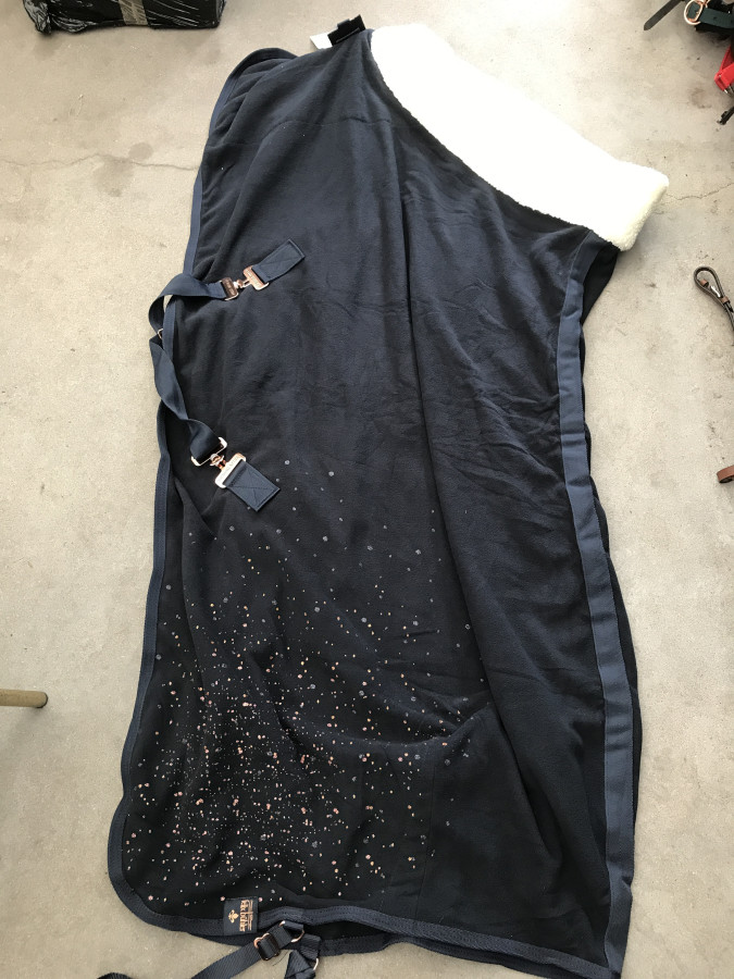 Przytulny, ciepły, a jednocześnie oddychający koc przeciwpotny wykonany z wysokiej jakości polaru antypillingowego z miękkim, grubo wyściełanym kołnierzem typu „teddy”. Na lewym tylnym panelu znajduje się uroczy nadruk z wielobarwnymi drobinkami brokatu. Gładka, przyjazna dla futra podszewka w okolicy klatki piersiowej i ramion zapobiega otarciom. Z odpinanymi pasami krzyżowymi po obu stronach, zapięciem z przodu na ukryte haftki w kształcie litery T oraz regulowanym paskiem pod pachą. 100% poliester.