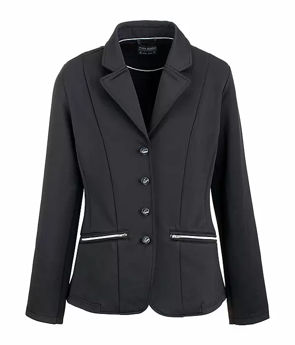 Elegancka marynarka konkursowa z detalami w kolorze srebra i dopasowanym krojem. Szczególnie elastyczny i łatwy w pielęgnacji materiał. Wymyślnie zaprojektowany marszczony wygląd z tyłu z metalowym emblematem Felixa Bühlera. 2 kieszenie zapinane na zamek i guziki z przodu. 95% poliester, 5% elastan.