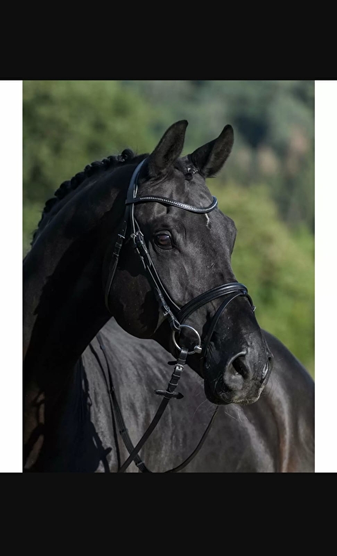 Błyskowa ogłowie z lekko zakrzywionym, dyskretnym naczółkiem z małymi białymi kamyczkami z brokatu. Nagłówek i cały nachrapnik są miękko wyściełane i zapewniają duży komfort. Prawdziwa skóra. Okucia w kolorze srebrnym.