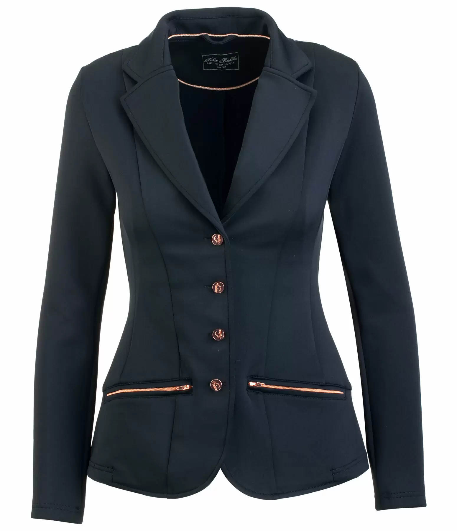 Elegancka marynarka konkursowa z detalami w kolorze srebra i dopasowanym krojem. Szczególnie elastyczny i łatwy w pielęgnacji materiał. Wymyślnie zaprojektowany marszczony wygląd z tyłu z metalowym emblematem Felixa Bühlera. 2 kieszenie zapinane na zamek i guziki z przodu. 95% poliester, 5% elastan.