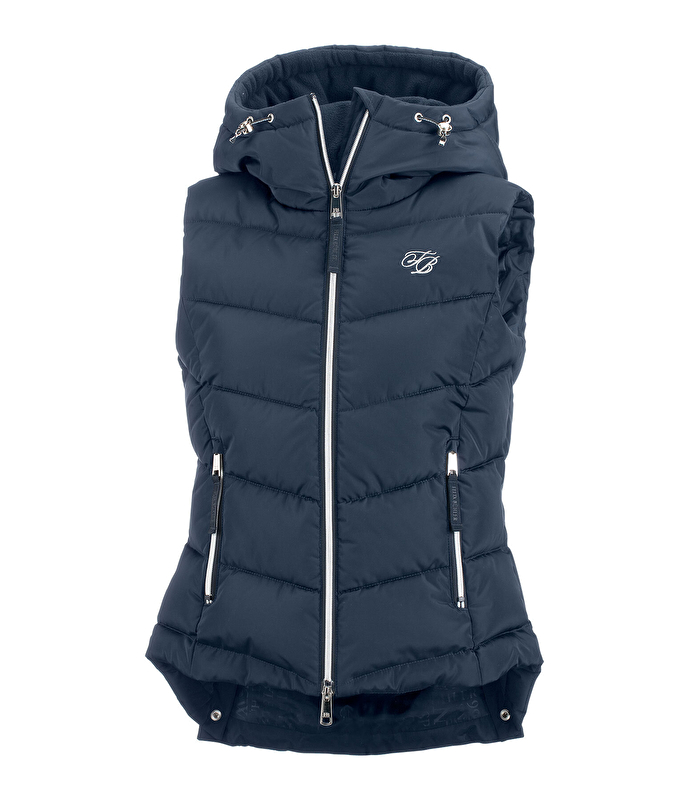 Super ładna, ciepła kamizelka jeździecka z wysokim, regulowanym kapturem, który jest podszyty polarem i można go dopiąć z tyłu. Dopasowany krój z dłuższym tyłem, 2 kieszeniami zapinanymi na zamek z przodu, krytym dwukierunkowym zamkiem błyskawicznym z osłoną podbródka i 2 rozcięciami do jazdy konnej zapinanymi na zatrzaski z tyłu. Miękkie wypełnienie z imitacji puchu. Wysokiej jakości hafty na piersi i kapturze.