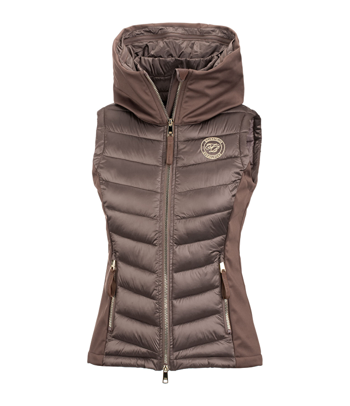 Niezwykle piękna, wiatroszczelna kamizelka jeździecka wykonana z miękkiego, połyskującego pikowanego materiału z lekkim wypełnieniem z imitacji puchu i bocznymi wstawkami z elastycznego softshellu. Podwójny kołnierz, chowany, pikowany kaptur w dużym zewnętrznym kołnierzu z zamkiem błyskawicznym i pięknym haftem. Błyszczący, kryty dwukierunkowy zamek błyskawiczny z przodu z osłoną podbródka, 2 przednimi kieszeniami zapinanymi na zamek i haftem Felixa Bühlera na piersi.