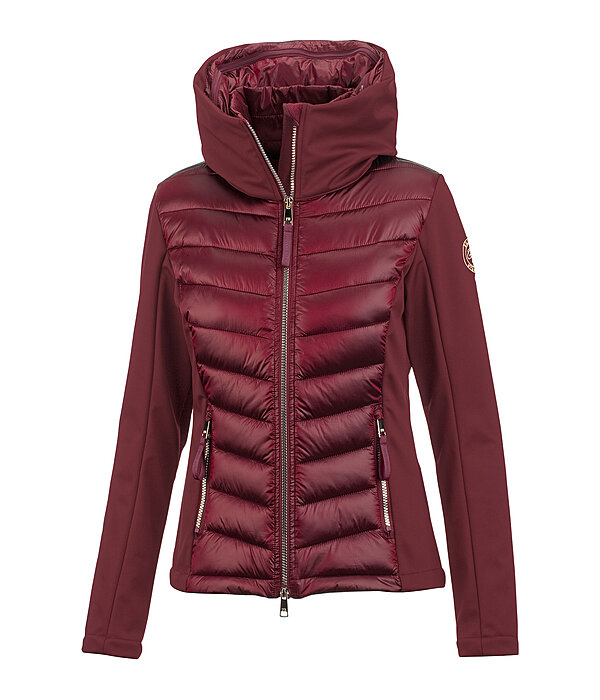Niezwykle szykowna, wiatroszczelna kurtka jeździecka wykonana z miękkiego, połyskującego, pikowanego materiału z lekkim wypełnieniem ze sztucznego puchu oraz rękawami i bocznymi wstawkami z elastycznego softshellu. Podwójny kołnierz, chowany, pikowany kaptur w dużym zewnętrznym kołnierzu z zamkiem błyskawicznym i pięknym haftem. Błyszczący, podszyty dwukierunkowy zamek błyskawiczny z osłoną podbródka, 2 przednimi kieszeniami zapinanymi na zamek i haftem Felixa Bühlera na rękawie.