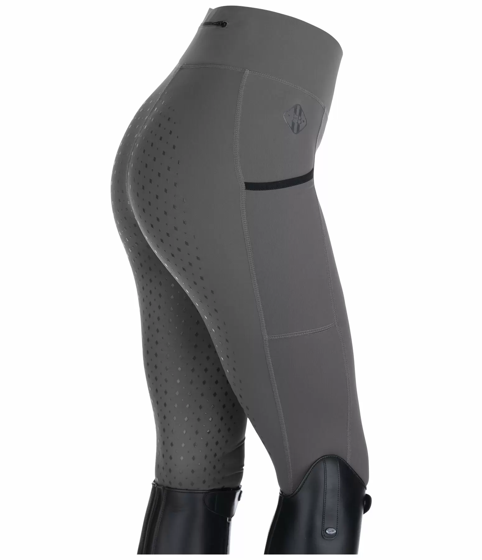 Niezwykle wygodne legginsy jeździeckie wykonane z wysokiej jakości materiału rozciągliwego w 4 kierunkach z pełnym silikonowym siedziskiem. Gładkie na zewnątrz i przytulne wewnątrz. Bardzo szeroki pas, tylna kieszeń na suwak, kieszeń na nogawce i elastyczne ściągacze nogawek bez rzepu. Materiał: 78% nylon, 22% elastan.