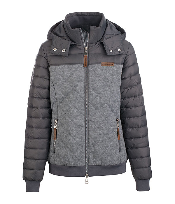 Pikowana kurtka przejściowa z odpinanym kapturem i 2 kieszeniami zapinanymi na zamek. Wykonane z wiatroszczelnych i oddychających materiałów. Kaptur można zamocować na miejscu. Elastyczne mankiety i pas.