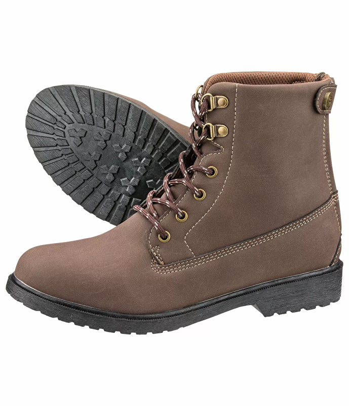 Stabilny but jeździecki z zamkiem błyskawicznym z tyłu umożliwiającym szybkie zakładanie i zdejmowanie. Cholewka wykonana ze skóry syntetycznej, wewnętrzna wyściółka z oddychającej tkaniny siateczkowej. Dalsze szczegóły obejmują szybkie sznurowanie i gumową podeszwę z przyjaznym dla jazdy obcasem.