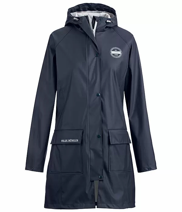 Długi płaszcz przeciwdeszczowy do jazdy konnej z kontrastową podszewką. Wodoodporna i wiatroszczelna. Ukryty dwukierunkowy zamek błyskawiczny z przodu, 2 rozcięcia do jazdy konnej z zatrzaskami z tyłu, 2 kieszenie z klapką, regulowany kaptur i szerokość rękawów, ochrona podbródka, odblaskowe nadruki z przodu i z tyłu.