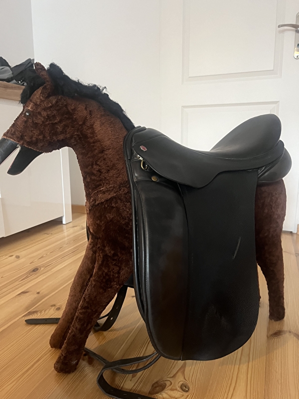Sprzedam siodło Albion Style na konia z krótkim grzbietem. Rozmiar siedziska 17, reszta wymiarów na foto. Siodło z nowym, wełnianym wypełnieniem. Przy wymianie wypełnienia był sprawdzony łęk i terlica, wszystko bez uszkodzeń. Siodło głębokie, bardzo wygodne, dające stabilne oparcie i pozostawiające swobodę, nie zakleszczające. Dzięki wycięciu na kłębie, będzie też pasowało na wykłębione konie. Siodło bez wad, widoczne normalne ślady użytkowania, niewielkie rysy czy odrobina rdzy na maszynkach.