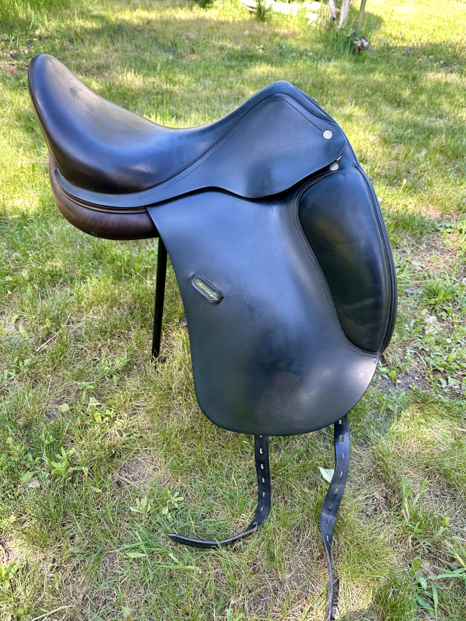 Do sprzedania siodło ujeżdżeniowe AMERIGO model Cervia .Siodło jest wykonane z pięknej włoskiej skory. Siodło ma bardzo miękkie siedzisko i bardzo miękko wyścielane bloki kolanowe co daje niesamowity komfort jazdy w tym siodle. Siodło jest dość głębokie ale nie jest ortopedyczne nie zakleszcza. Kolor czarny , Ale od spodu ciemny brąz. Łęk szeroki ok 33. Cena atrakcyjna , ze względu na stan przedniego lęku. Lekkie przetarcia skóry. Wysyłka za pobraniem. Istnieje możliwość przymiarki