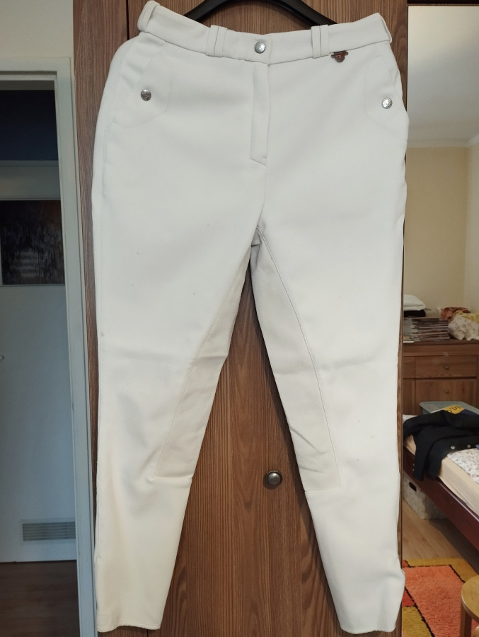 Bryczesy są używane, w bardzo dobrym stanie. Grubszy, prążkowany materiał. Lej ma lekkie odbarwienia. Bryczesy mają też malutkie plamki, pokazane na zdjęciu. Od błota podczas zawodów.