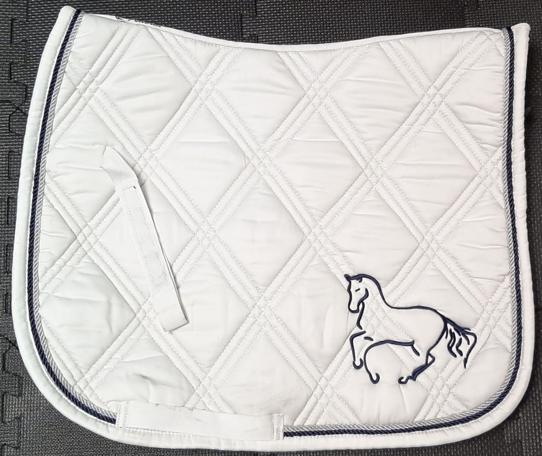 Sprzedam czaprak ujeżdżeniowy Caball robiony na zamówienie, w kolorze białym. Z jednej strony ma wyhaftowanego granatową nicią konika. Sznurki w kolorach srebrnym i granatowym.