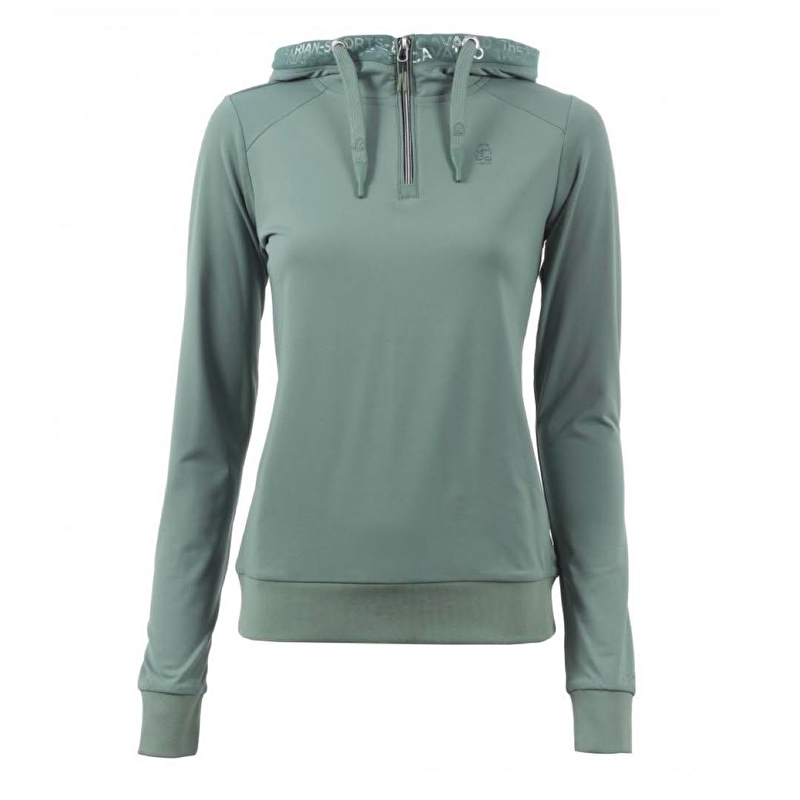 Bluza jezdziecka Cavallo. Kolor zielony sea green. Bardzo ciekawy nie rażący. Bluza z kapturem wykonana z lekko szczotkowanej, dwuelastycznej tkaniny funkcjonalnej. Nadruk Cavallo pokryty siateczką na krawędzi kaptura. Ściągacze przy mankietach i na dole,
