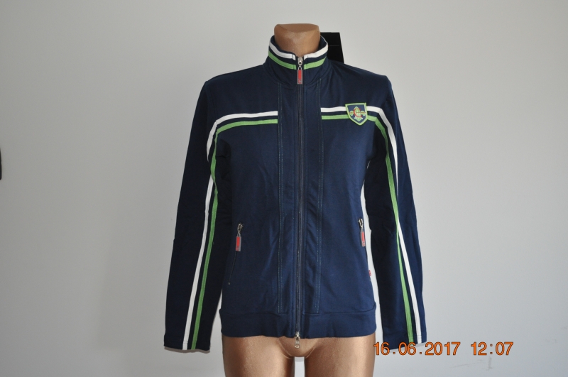 Posiadam na sprzedaż nową bluzę firmy Covalliero. Granatowa, z biało-zielonymi wstawkami. Zapinana na zamek od góry i od dołu. Dwie płaskie kieszenie zapinane na suwak.