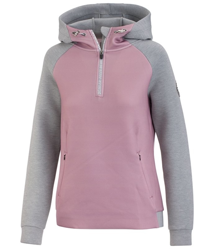 Sportowa bluza Felix buhler model Lucy w modnym dwukolorowym wyglądzie, wykonana z elastycznej mieszanki bawełny. 2 kieszenie boczne z suwakami, suwak z nadrukiem z logo, elastyczny pas, kaptur który można w razie potrzeby regulować na szerokość za pomocą sznurka. Odznaka Felixa Bühlera na lewym ramieniu . Materiał: 70% poliester, 25% wiskoza, 5% elastan