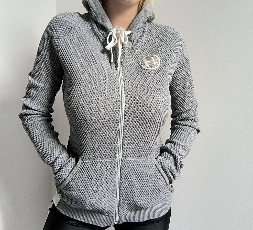 Bluza jezdziecka harcour..szara. świetny materiał taki Ala swterkowy dzięki czemu jest bardzo elastyczna łatwo dopasuje się do sylwetki. Nie ma podszycia. Kieszenie na zamek. Fajna komfortowa bluza z kapturem. Stan bardzo dobry jedynie do przeprania dolne części rękawa lekko zabrudzone. Idelane dla osób z dłuższym rękami wyższych. Rozmiar S, M