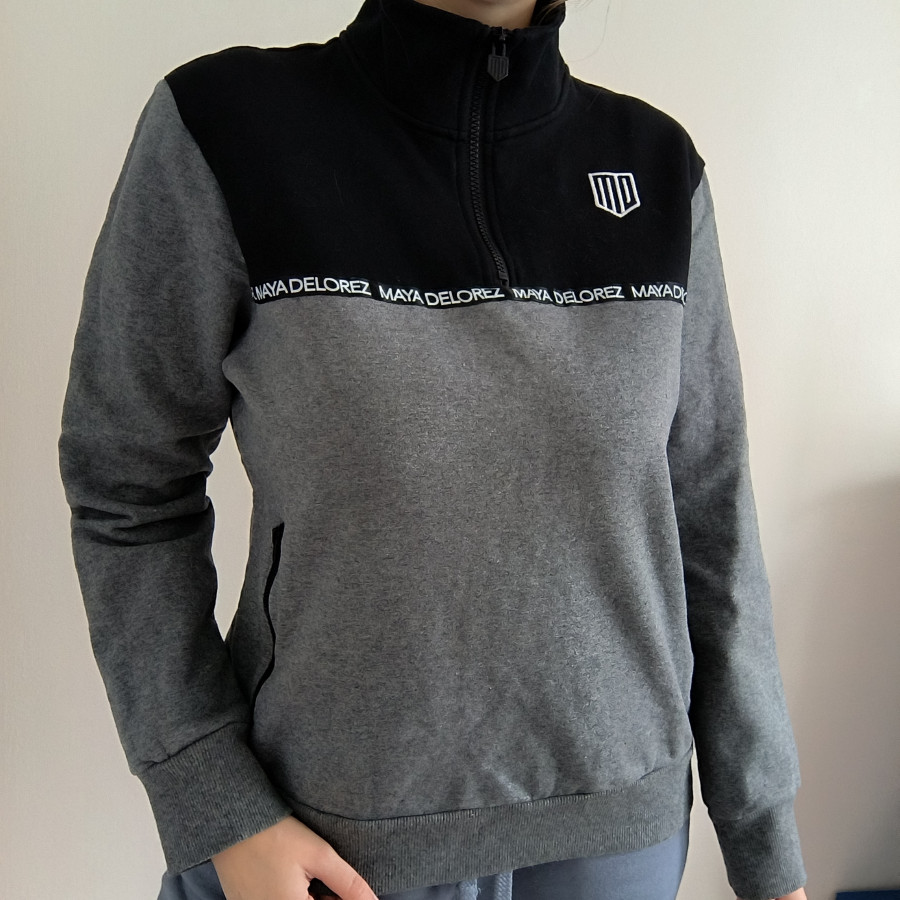 Bluza jezdziecka Maya delorez. Szaro czarna. Z ładnym logowaniem subtelnym. Styl bardzo casual nie tylko do stajni. Z lekkim podszyciem. Na zameczek z wyższym kołnierzem. Kieszenie tez na zamek. Bardzo fajna i komfortowa bluza. Stan bardzo dobry lekkie ślady użytkowania na czarnym Materiale w okolicy szwu. Do wyprania Rozmiar XS