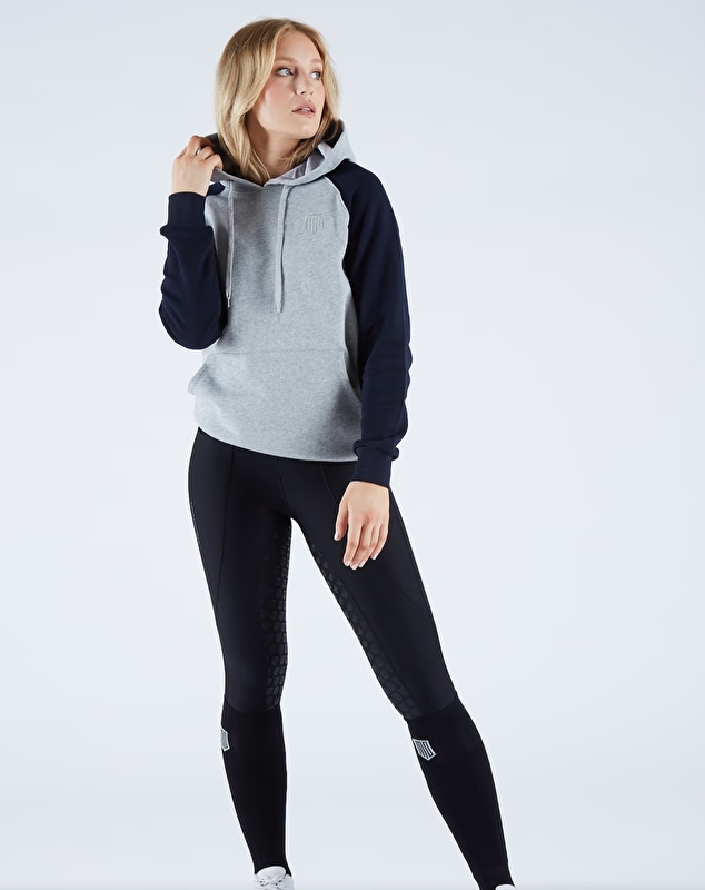 Bluza jezdziecka Maya delorez. Szara z rękawami w kolorze granatowym. Z sporymi kieszeniami i dużym kapturem. Nie ma podszycia. Jej luźny krój jest idealny dla osób które cenią sobie komfort i wygodę. Ściągacz na dole nożna dopasować do bioder. Nadaje się nie tylko do stajni ale również na cozdzien przez Minimalistyczne logo na piersi. Nie używane. Unisex dla kobiet i mężczyzn. Dla wyższych osób.
