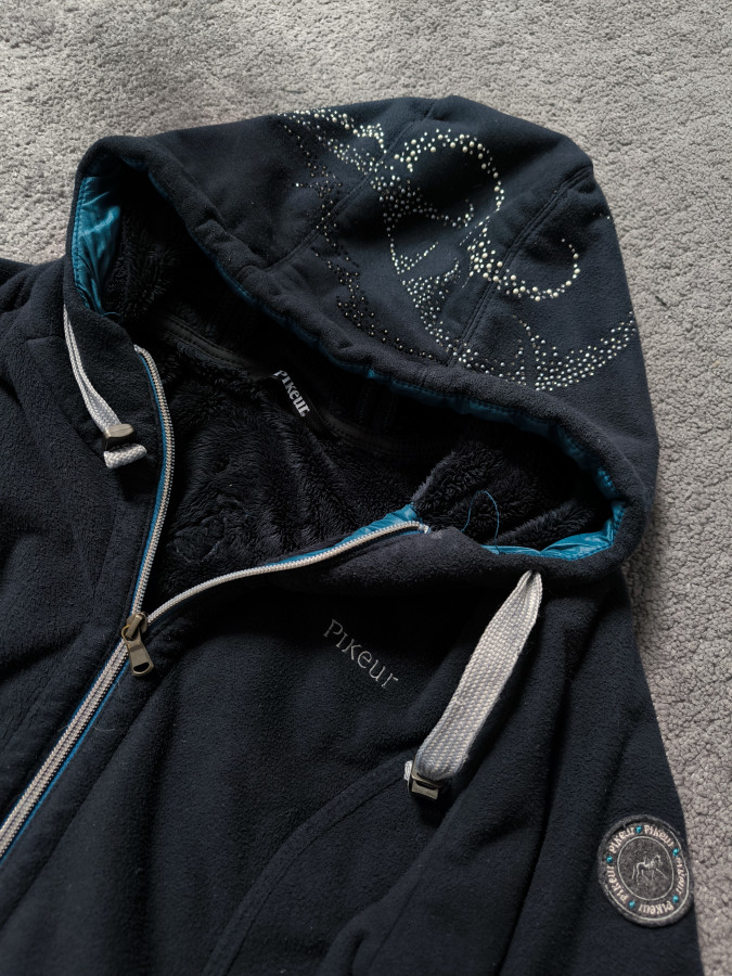Bluza jezdziecka Pikeur. Garrida. Granatowa. Z pięknym zrobieniem na kapturze ! Wygląda to obłędnie :) dodatkowo jest to ultra przyjemny polarek. W takim nie ma szans że zmarzniesz. Spójrz na zdjęcia jak wygląda od spodu. Jest mega miciutki misiek który super grzeje. Polar jest solidny gruby idealny na chłodne dni w stajni. Nie dość że ciepło to jeszcze stylowo mimo że model jest starszy to dzięki aplikacji na kapturze wygląda bardzo nowoczesnie. Są ściągacze na biodrach. Stan bardzo dobry.mozliwe lekkie ślady użytkowania. Rozmiar 72 z metki pasuje na S 36 szerokość 47 cm x2 dl całkowita od ramienia 63 cm Dl rękawa od pachy 51 cm