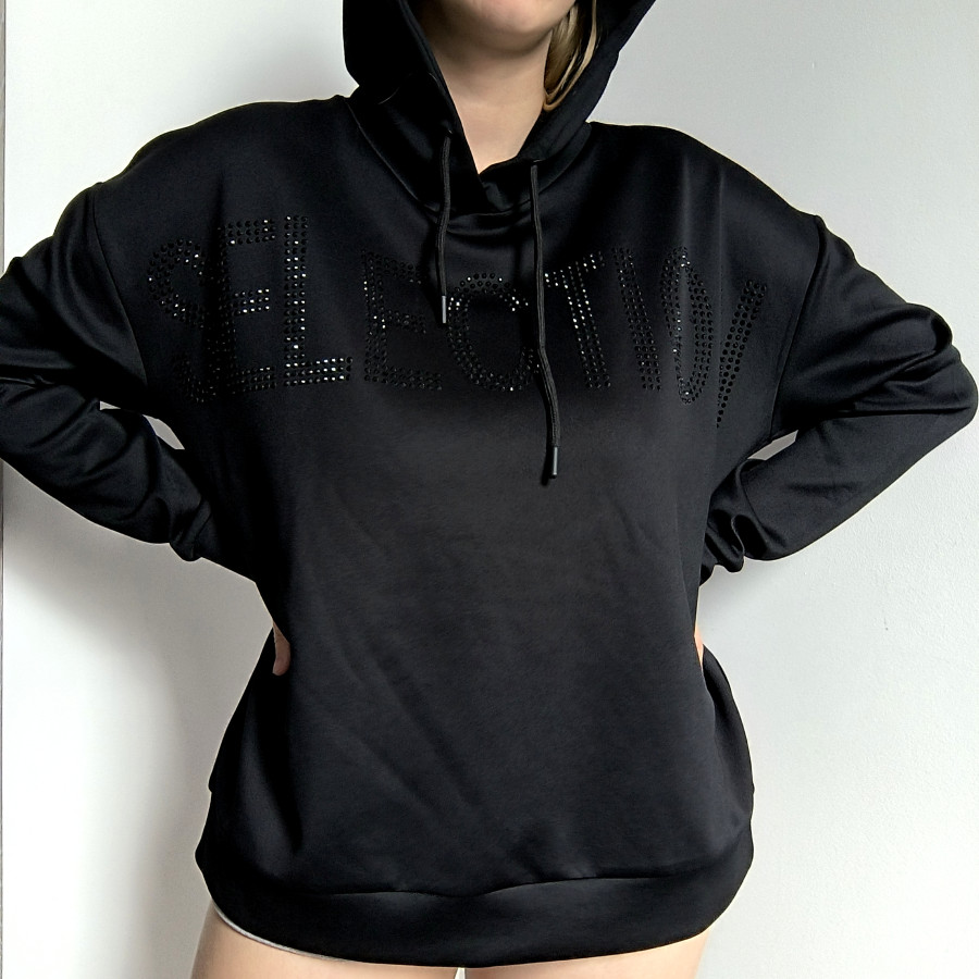 Bluza jezdziecka Pikeur. Model phine. Czarna z pięknymi mieniącymi się zdobieniami. Kryształki pięknie się prezentują i podczas ruchu mienia się tworząc niebywały efekt. Musisz się o tym przekonać sama ;) nie ma kieszeni. Jest kaptur. Krój jest ovsersize luźny lekki idealny dla osób które cenią sobie wygodę. Bluza nie ma podszycia. Zdecydowanie warta uwagi i przyciąga wzrok każdego. Stan bardzo dobry do przeprania. Przy "o" jest mały zadziorek. Rozm L z metki.