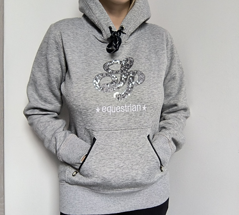 Bluza jezdziecka Spooks. Szara z cekinowym logo na klatce. Wygląda świetnie dzięki temu. Ma lekkie podszycie. Jest komfortowa i wygodna . Z dużym kapturem i kieszeniami na zamek. Stan bardzo dobry lekkie ślady użytkowania. Brakuje jednego kółka gdzie wychodzi sznurek do kaptura Rozmiar M szerokość 50 cm x2 dl całkowita od ramienia i rękawa 63 cm