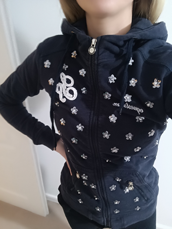 Bluza ma małą dziurką o wielkości paznokcia, która znajduje się tylko na wierzchniej warstwie materiału. Uszkodzenie jest subtelne i nie rzuca się mocno w oczy, a struktura materiału pod spodem pozostaje nienaruszona.