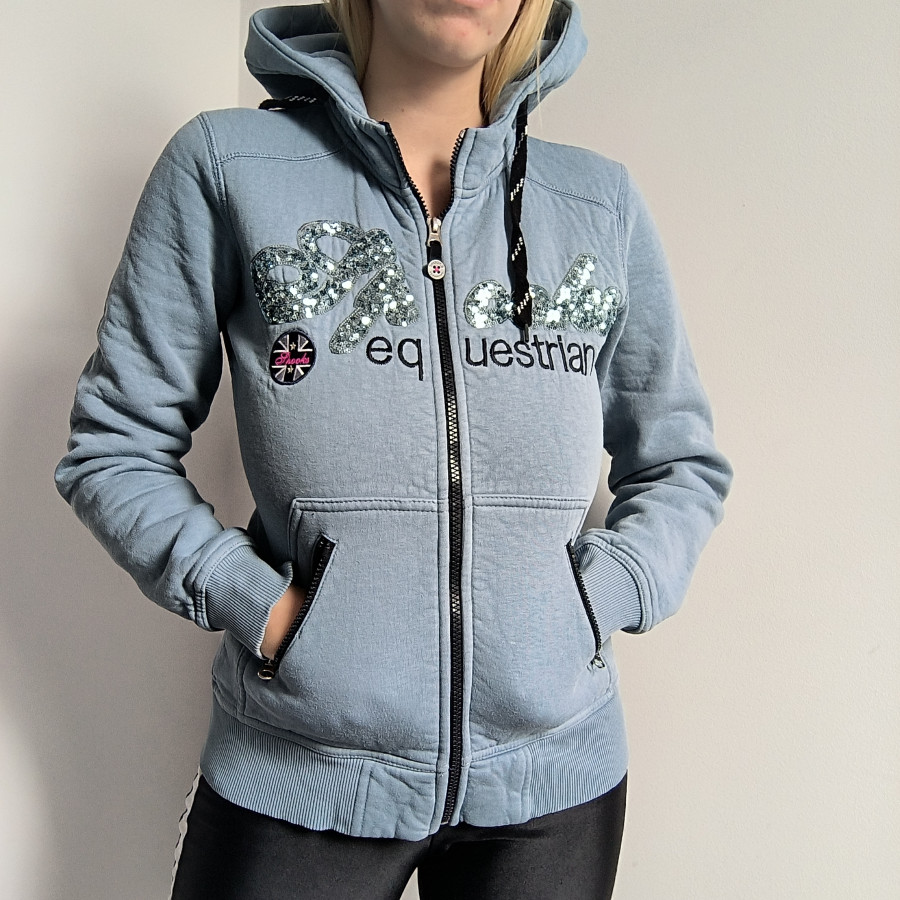 Bluza jezdziecka Spooks. Błękitna z pięknym zdobionym napisem na piersi. Z cekinow dzięki czemu chwyta za oko. Z dużym kapturem, kieszenie na zamek. Wygodna i stylowa.