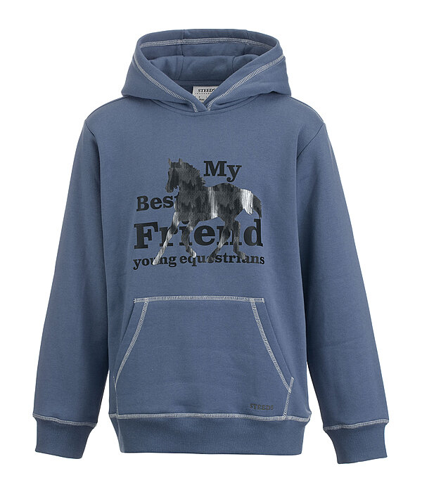 Sportowa bluza dresowa z kapturem i kangurkową kieszenią z przodu. Z przodu duży, piękny nadruk konia. Szwy w kontrastowym kolorze, miękki prążkowany materiał na mankietach iu dołu. 60% bawełna, 40% poliester.