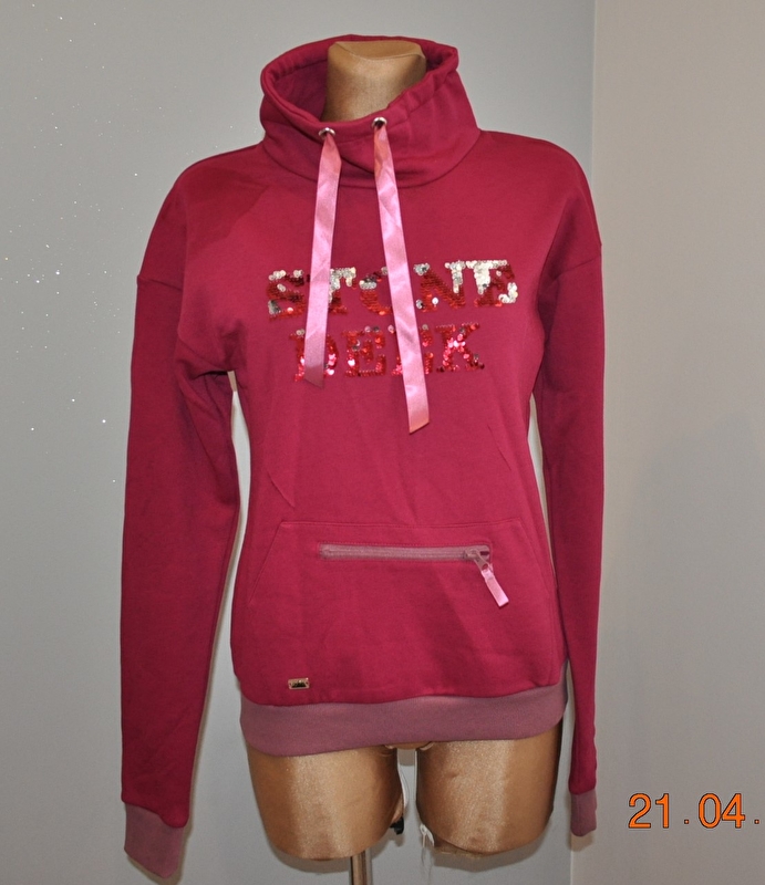 Piękny, ciepły sweter ze wspaniałym cekinowym logo na piersi. Elastyczny pas i mankiety w kontrastowym kolorze. Sznurki z taśmy satynowej. Kieszeń kangurka może być zamykana na suwak. 65% bawełna, 35% elastan.