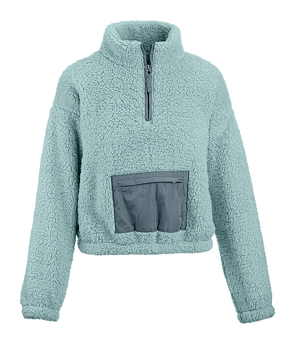 Swobodny, krótki sweter Sherpa z zamkiem w kolorze różowego złota na kołnierzu umożliwiającym szybkie zakładanie oraz kontrastową naszywaną kieszenią zapinaną na zamek do przechowywania telefonów komórkowych itp. z przodu. Z elastycznym, marszczonym elastycznym paskiem przy mankietach. 100% poliester.