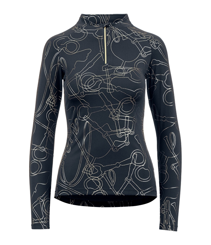 Niezwykle szykowna, funkcjonalna koszula z długim rękawem i efektownym, metalicznym nadrukiem na całej powierzchni. Z raglanowymi rękawami, stójką, zamkiem błyskawicznym i osłoną podbródka. Oddychający i szybkoschnący materiał. 88% poliester, 12% elastan.