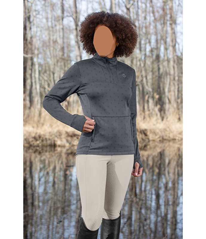 Wygodna, ciepła, funkcjonalna bluzka ze stójką i zamkiem błyskawicznym z ochroną podbródka. Oddychający i szybkoschnący. Z przodu kieszeń kangurka zapinana na zamek, naszywki z logo na piersi i u dołu z tyłu, otwory na kciuki i subtelny nadruk logo na całej powierzchni. Nieco dłuższy tył. 91% poliester, 9% elastan.