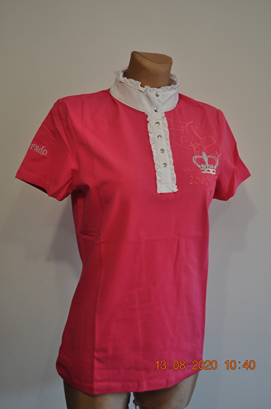 Damska koszulka konkursowa, wykonana ze specjalnego elastycznego i oddychającego włókna bawełniano-elastanowego. Włókno to zapewnia idealny komfort przy każdym ruchu. Jak druga skóra. Połączenie koronki, kryształowego guzika i haftu lureksowego sprawia, że ta koszulka będzie atrakcyjnym elementem każdego turnieju. Materiał: 95% bawełna, 5% elastan.