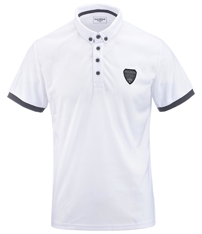 Wysokiej jakości męska koszulka konkursowa o prostym kroju, wykonana z szybkoschnącego, oddychającego i rozciągliwego funkcjonalnego materiału. Kołnierz zapinany na guziki, mankiety w kontrastowym kolorze i naszywka na piersi. Wnętrze kołnierza i stójka w kontrastowym kolorze. 100% poliestru.