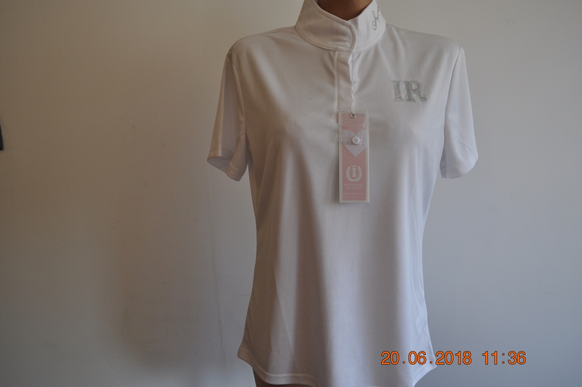 Sprzedam elegancką, lekką, rozciągliwą koszulkę konkursową marki Imperial Riding model Loretta w kolorze białym. Koszulka z białym kołnierzem, zdobiona cekinami, zapinana na guziki przy szyi.