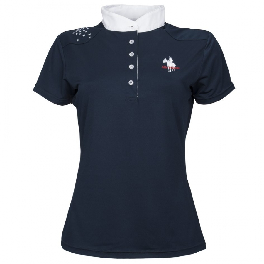 Bardzo elegancka koszulka konkursowa, damska, z wysokim kołnierzem. Granatowa, z białym kołnierzykiem. Zapinana na guziki. Zdobiona haftowanymi gwiazdkami na ramieniu. Logo z przodu, flaga na plecach. Efektowny nadruk.