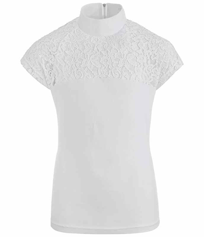 Modna dziecięca koszulka konkursowa wykonana z elastycznej dzianiny bawełnianej z wstawkami i rękawami z delikatnej, elastycznej koronki. Stójka z zamkiem błyskawicznym i wyszytym srebrnym logo z tyłu. Oddychająca. 95% bawełna, 5% spandex