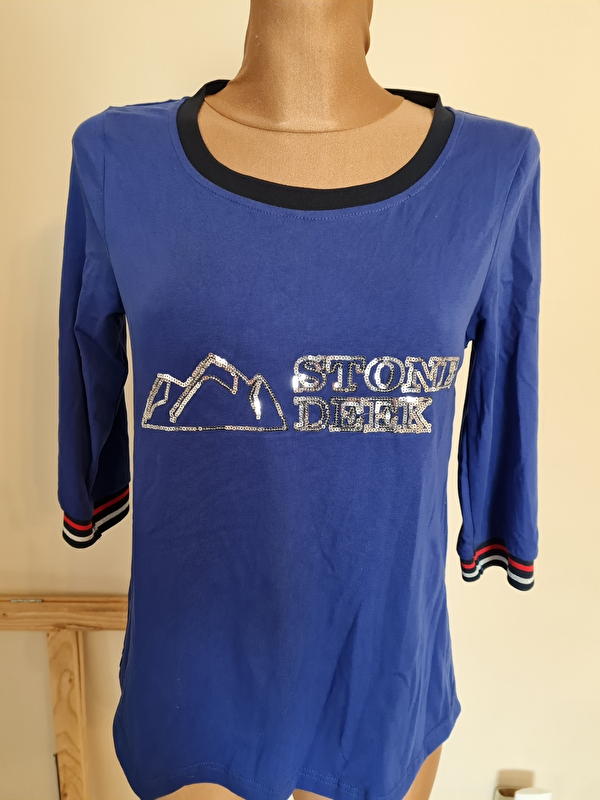 Luźna koszula z okrągłym dekoltem i rękawem 3/4 na letnie dni w stajni. Lekko zdobione cekinowe logo z przodu. 95% bawełna, 5% spandex.