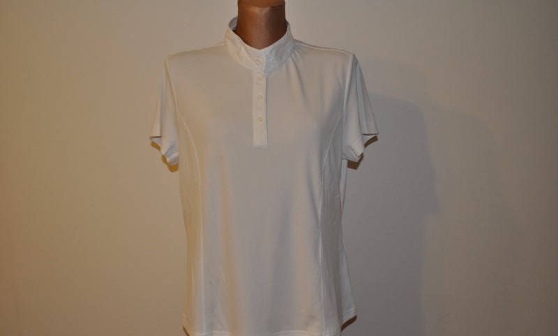 Sprzedam nowa, z metkami, w opakowaniu, bluzkę/koszulkę turniejową Iris Bayer. Bluzka męska, biała, rozmiar 46. Pomimo nowości, koszulka posiada plamkę z przodu oraz przetarcie z prawej strony pod rękawem. Zapinana na guziki od góry, z kołnierzem, krótki rękaw.