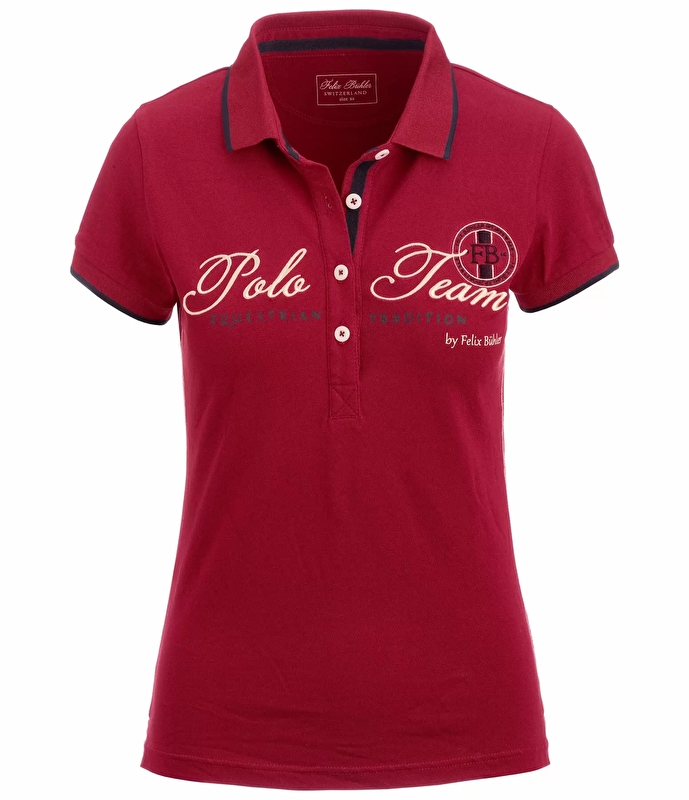 Klasyk do jazdy konnej. Sportowa damska koszulka polo wykonana z bawełny. Haft i nadruki na przodzie. Wysokiej jakości, elastyczna bawełniana pika. Zapięcie na guziki i boczne rozcięcia z kontrastowymi tasiemkami. 95% bawełna, 5% spandex.