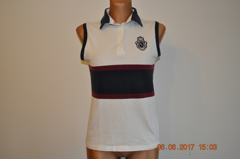 Sprzedam bluzkę polo, bez rękawów, firmy Kingsland. Damska, w rozmiarze L, biała. Przy rękawach zakończona granatową lamówką. Posiada granatowy kołnierz, logo z przodu oraz z tyłu, poprzeczny pasek granatowo-bordowy.
