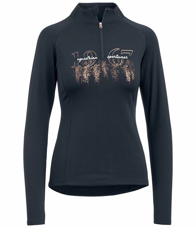 Piękna, miękka i elastyczna funkcjonalna koszulka z długim rękawem ze stójką i zamkiem błyskawicznym. Oddychająca i szybkoschnąca. Brokatowy nadruk z przodu. Mięsista, ocieplana.