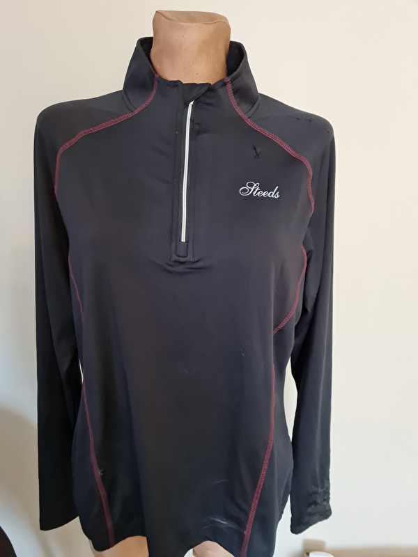Elastyczna i miękka koszula jeździecka z długimi rękawami, zamkiem błyskawicznym i stójką. Na piersi połyskujący nadruk. Oddychająca i szybkoschnąca. Materiał: 88% poliester, 12% elastan.