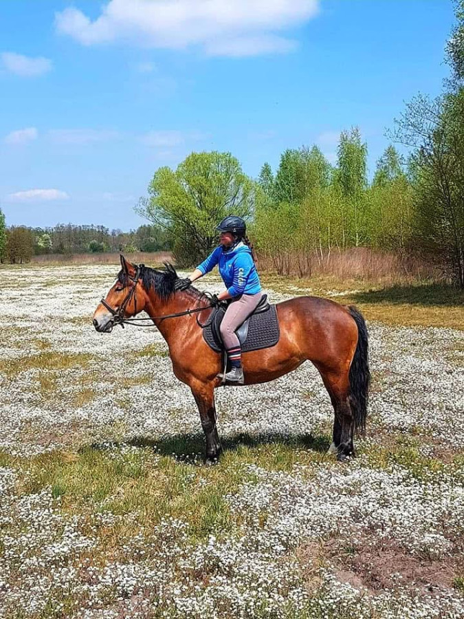 Bezproblemowa w obsłudze, na jeździe grzeczna, nie bryka i nie ponosi. Fantastyczna w tereny, chodzi na sam głos i dosiad. Niczego się nie boi