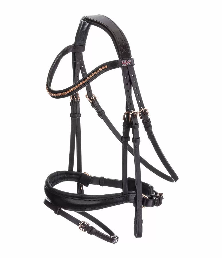 Brązowe, anatomiczne ogłowie Claridge House COB, okucia rose gold.