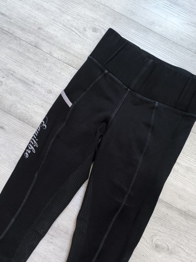 Breginsy Bryczesy leginsowe Equilibre. Czarne z szarymi wstawkami. Bawełniane. Z kieszenią na udzie co docenia Amazonki. Jest też kieszen z tyłu na zamek. Stan bardzo dobry, ale maja dziurkę na kieszeni i zabrudzenie na udzie. Pełny silikonowy lej ekstra stan. Idelane dla osoby 34 XS szczupłej w biodrach. Wysoki stan