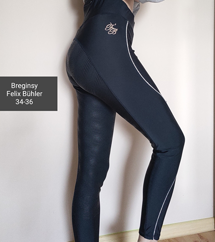 Breginsy Felix Bühler. Granatowe z srebrna tasiemka po nodze która super nadaje optycznie kształtów i optycznie wyszczupla sylwtke. Bardzo wygodne, materiał sliski dzieki czemu nie przyczepia sie tak brud. Nie maja kieszeni bocznej jedynie z tylu na pasie na zamek. Stan bardzo dobry ,lekkie ślady na tasiemce srebrnej. N apasie na szwach puscilo kilka nitek. napis Fb przy pasie starty. Rozmiar 34 wymiary pas 33-38 cm x2 długość całkowita 87 cm