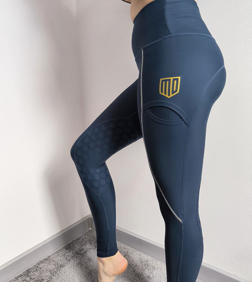 breginsy Bryczesy leginsowe Maya delorez. Granatowe z złotym logo na udzie. Mają kieszeń na udach ! Super atut który docenia Amazonki. Leginsy cudnie układają się na sylwetce i na każdej leżą równie dobrze. Łatwo się dopasowują do ciała. Przylegają nie odstają. Są jak druga skóra a komfort to ich "drugie imię " zdecydowanie możesz w nich przechodzić cały dzień bez zmartwienia o wygodę. Mają wysoki szeroki stan pas który fajnie trzyma talie. Stan bardzo dobry, mają lekkie ślady użytkowania na leju. Lekkie nadszarpnięcia szwu jak na zdjęciu. Lej jest mocno trzymający w siodle kolanowy . Rozmiar z metki xxs jednak pasuje spokojnie też na XS standardowy pas 32-37cmx2 dl całkowita 85 cm oczywiście stan wysoki