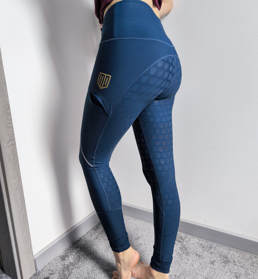 breginsy Bryczesy leginsowe Maya delorez. Granatowe z złotym logo na udzie. Mają kieszeń na udach ! Super atut który docenia Amazonki. Leginsy cudnie układają się na sylwetce i na każdej leżą równie dobrze. Łatwo się dopasowują do ciała. Przylegają nie odstają. Są jak druga skóra a komfort to ich "drugie imię " zdecydowanie możesz w nich przechodzić cały dzień bez zmartwienia o wygodę. Mają wysoki szeroki stan pas który fajnie trzyma talie. Stan bardzo dobry, jednak po jednej stronie leja w zależności od padającego światła czasami mieni się na złoto. Jest też ślad na logo. Poza tym bez wad super stan. Rozmiar 36 S pas 35-40 cm x2 dl całkowita 90cm