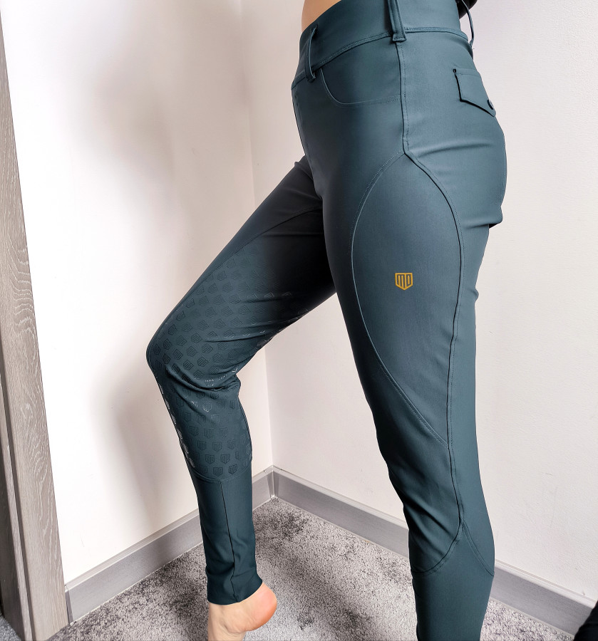 breginsy Bryczesy leginsowe Maya delorez. Model performance. Kolor butelkowa zieleń ! Ciemnozielone Mają kieszeń na udzie ! Super atut który docenia Amazonki. Leginsy cudnie układają się na sylwetce i na każdej leżą równie dobrze. Łatwo się dopasowują do ciała. Przylegają. Są jak druga skóra a komfort to ich "drugie imię " zdecydowanie możesz w nich przechodzić cały dzień bez zmartwienia o wygodę. Mają pas z szlufkami a sam pas jest średnio/wysoki. Kieszenie to atrapki, jedynie na udzie jest wsuwana. Stan bardzo dobry Lej jest mocno trzymający w siodle Rozmiarpasuje na 40 L i 42 xl są mocno elastyczne. pas 40-46cmx2 dl całkowita 95 cm Cena katalogowa około 600 zł. Niedostępne w Polsce.